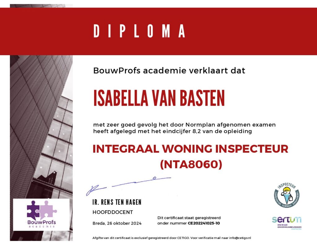 Mijn naam is Isabella en ik werk als ZZP’er aan diverse projecten, met name op het gebied van het opleveren van appartementencomplexen. Hoewel ik mijn IWI-diploma niet inzet als officieel beroepsmatig specialisme, benut ik de kennis en ervaring wel actief binnen mijn projecten. Ik volg deze opleiding vooral omdat ik het waardevol vind om mijn expertise te verbreden en mezelf continu te blijven ontwikkelen.