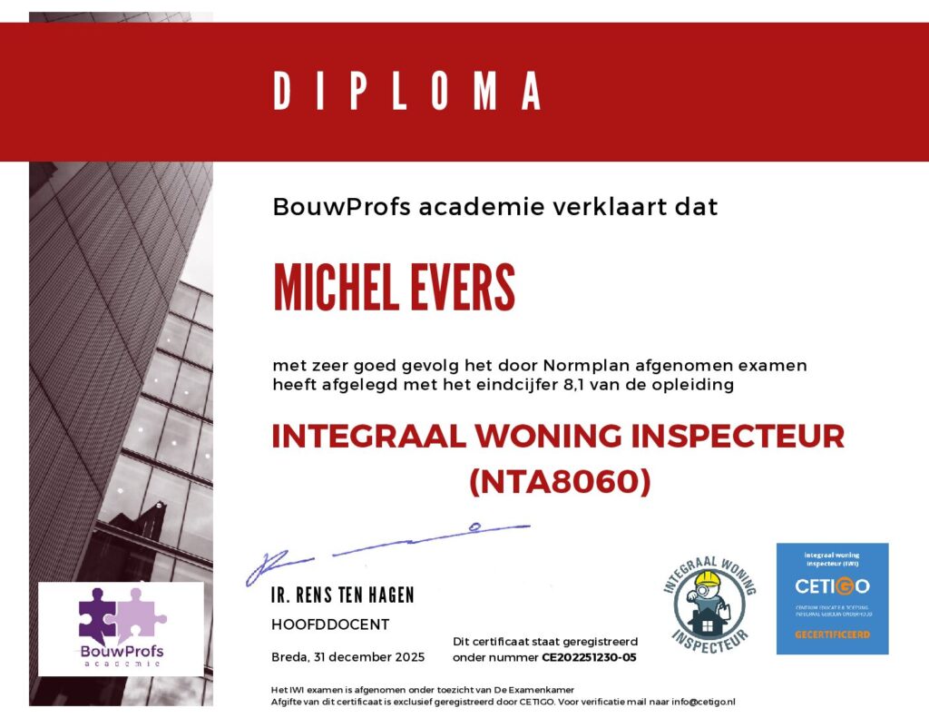 Ik ben een gecertificeerd Integraal Woning Inspecteur (IWI) met ruim 25 jaar ervaring in de bouwpraktijk. Vanuit mijn dagelijkse werkzaamheden inspecteer ik woningen met een sterke focus op bouwkundige kwaliteit, gebreken en inzicht voor de opdrachtgever.